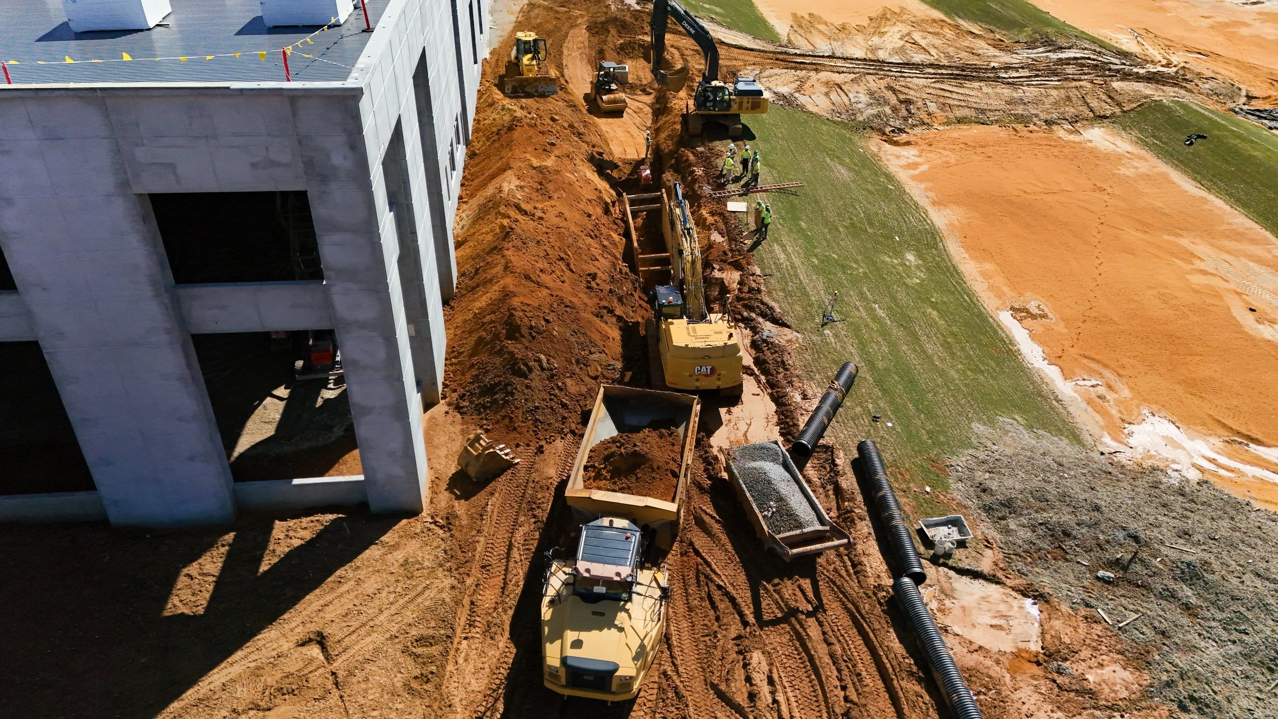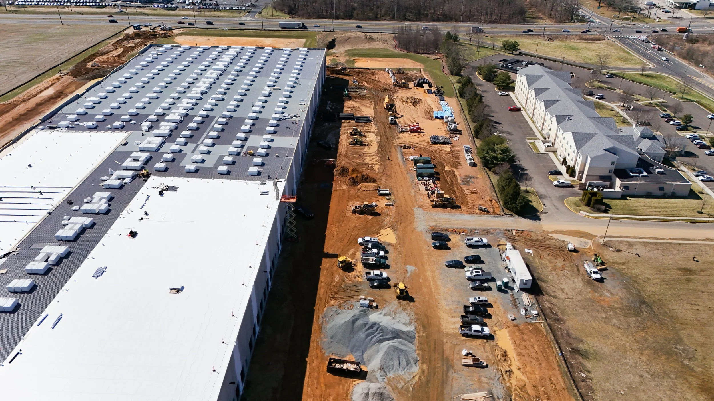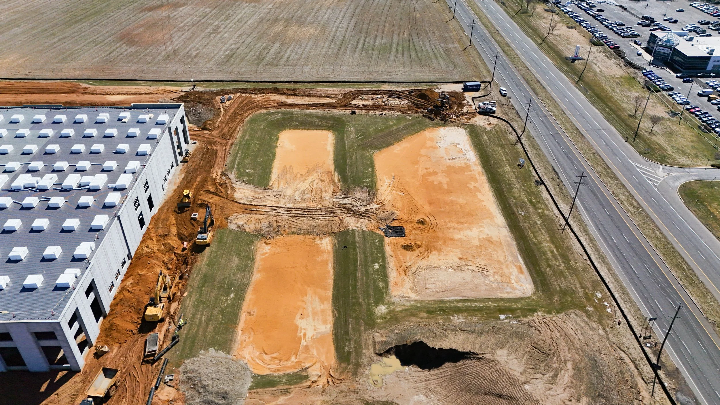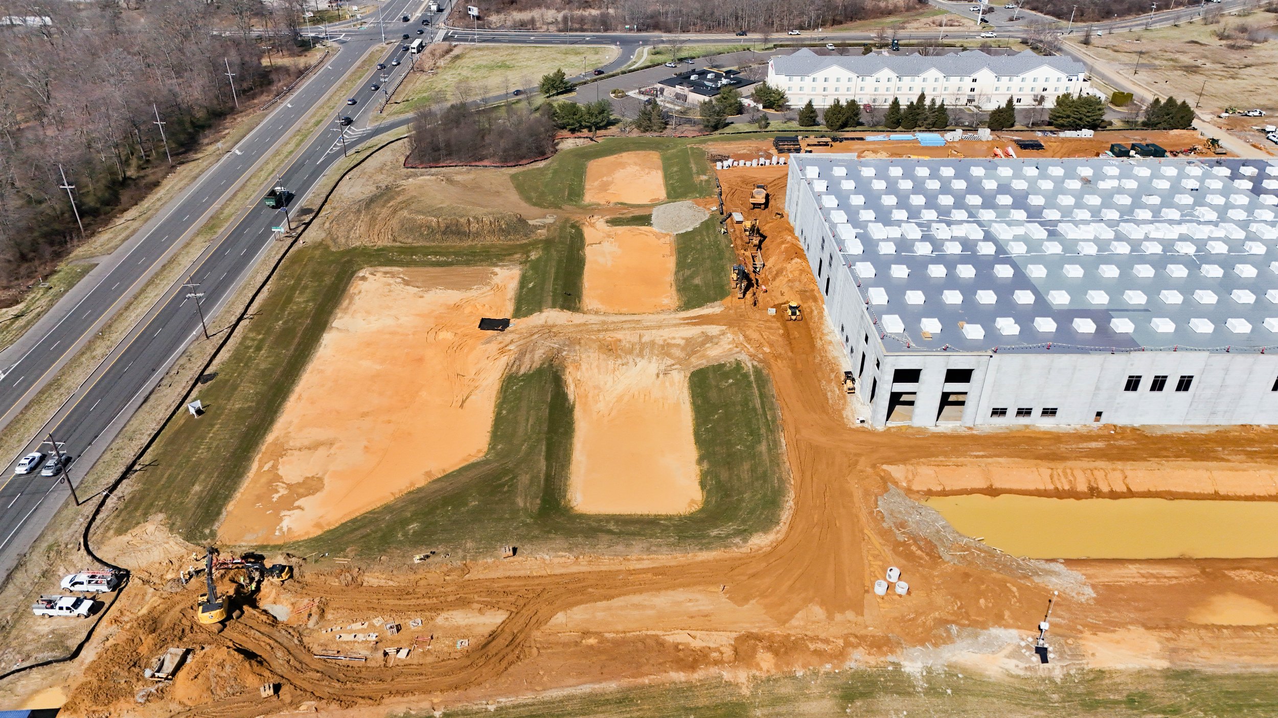 The site features over 58,000 cubic yards of balanced cut-to-fill earthwork, eliminating the need for import material. The scope also includes installation of 7,395 linear feet of storm drainage, 260 linear feet of sanitary sewer, 8,135 linear feet of concrete curb, and 11,994 square feet of sidewalk. Additional paving work includes 2,668 tons of 9.5M64 surface course, 5,337 tons of 19M64 stabilized base, and 830 tons of 9.5 open graded friction course. Diamond will also pour 490 cubic yards of concrete throughout the site.