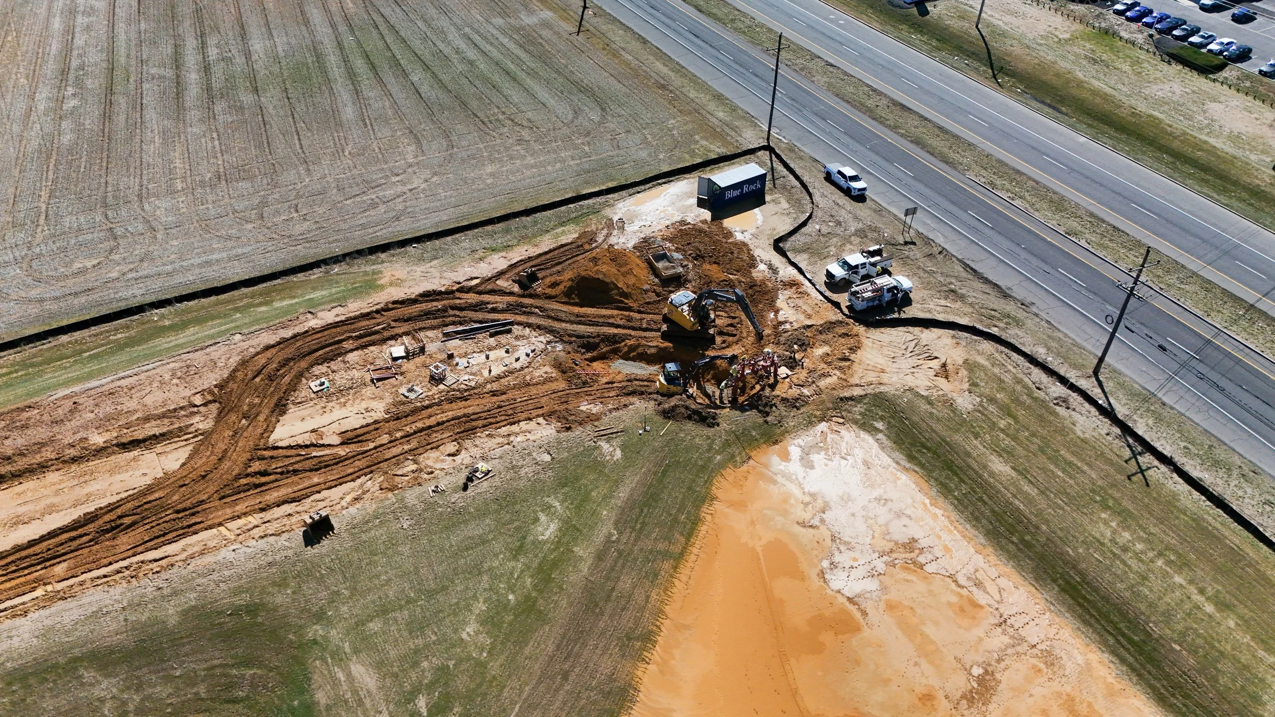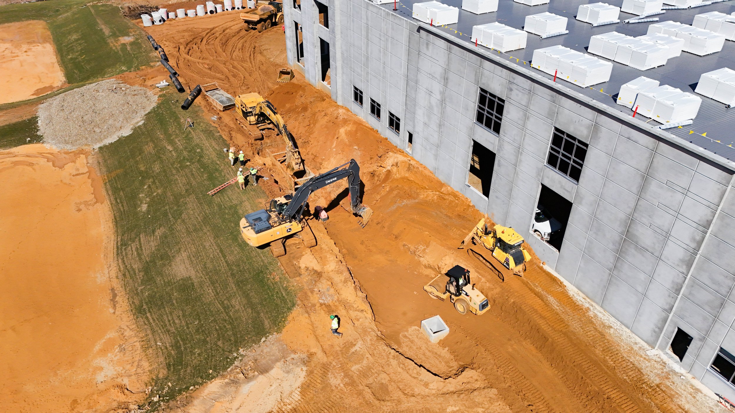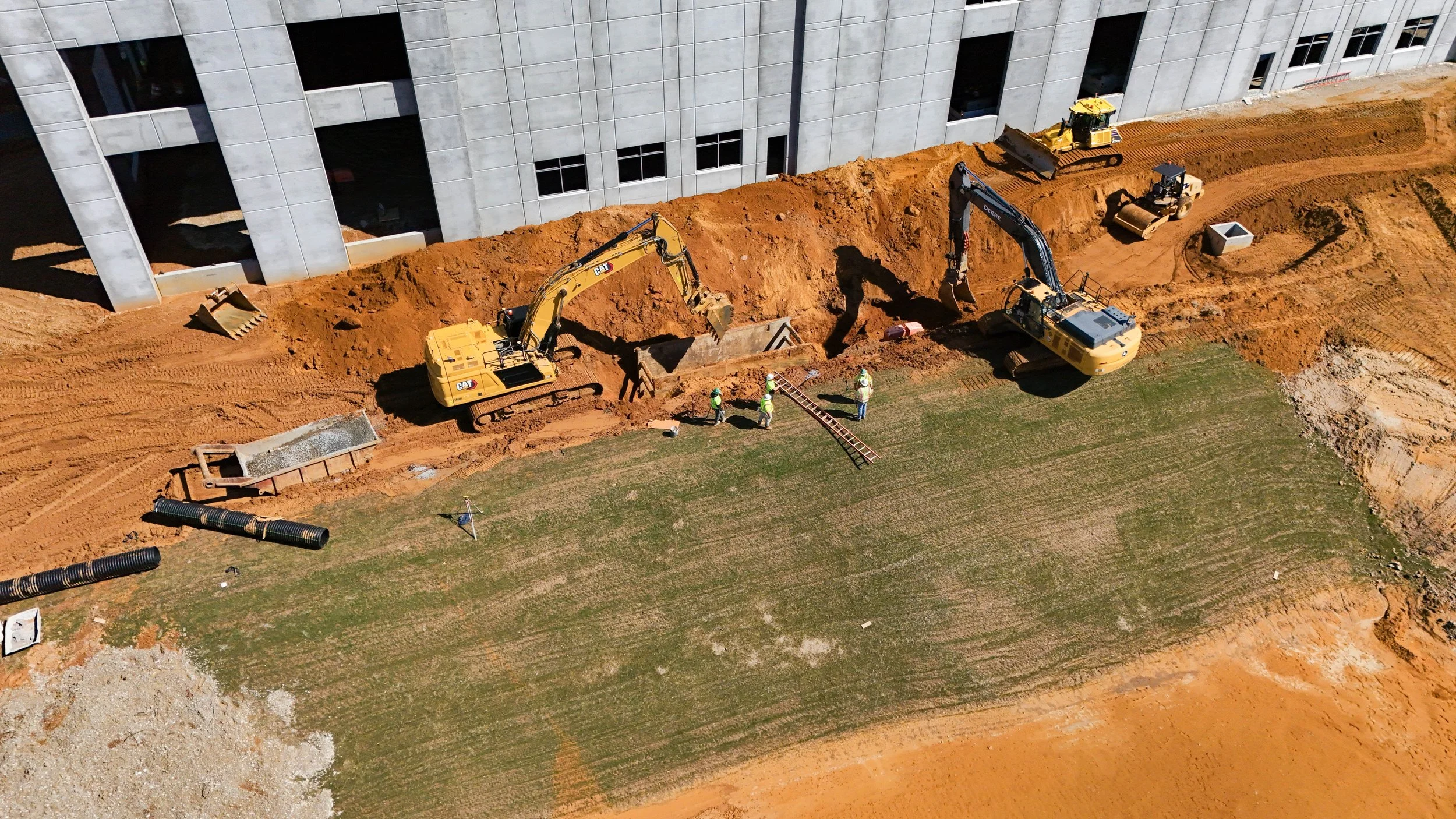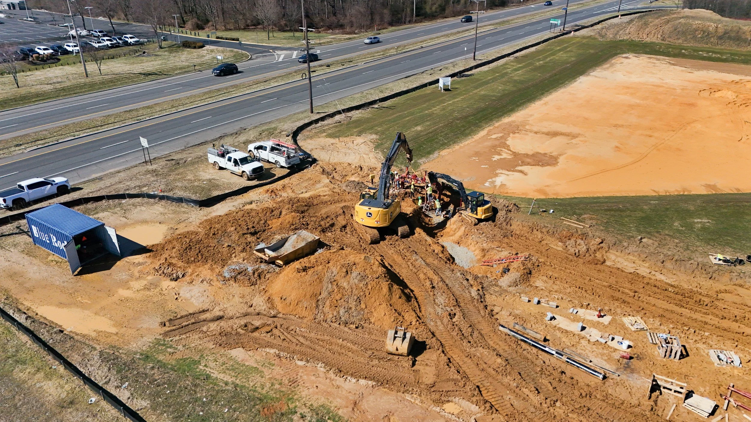 The site features over 58,000 cubic yards of balanced cut-to-fill earthwork, eliminating the need for import material. The scope also includes installation of 7,395 linear feet of storm drainage, 260 linear feet of sanitary sewer, 8,135 linear feet of concrete curb, and 11,994 square feet of sidewalk. Additional paving work includes 2,668 tons of 9.5M64 surface course, 5,337 tons of 19M64 stabilized base, and 830 tons of 9.5 open graded friction course. Diamond will also pour 490 cubic yards of concrete throughout the site.